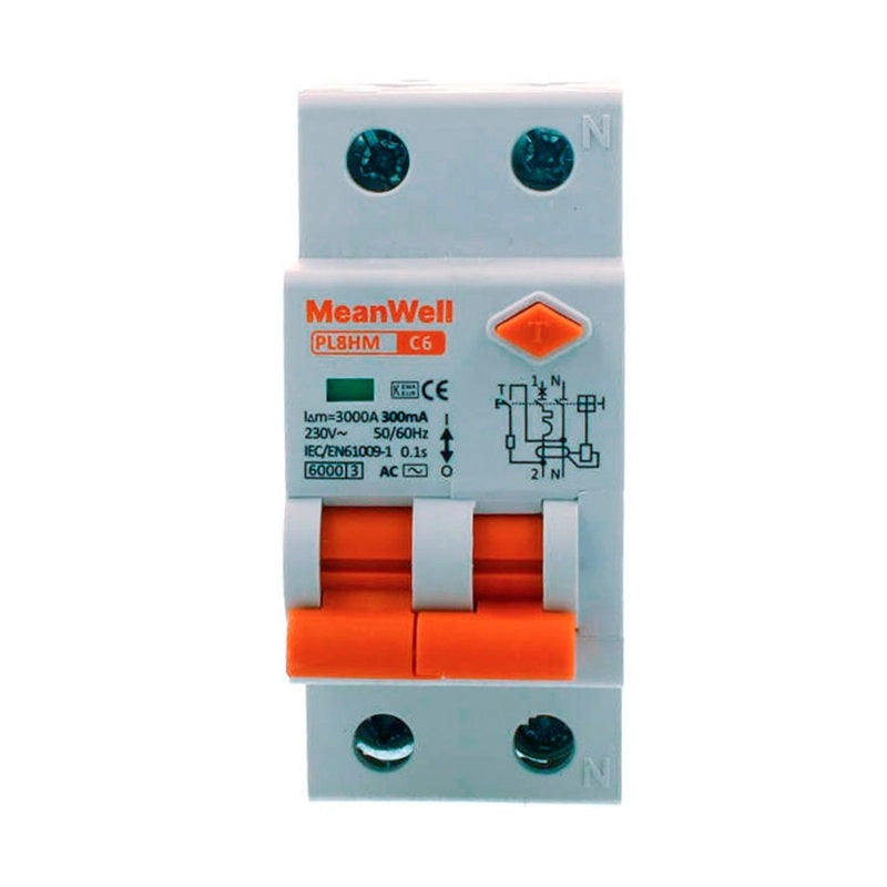 Magnetotermico Differenziale MeanWell Tipo AC Curva C 1 Polo+Neutro 2M 6kA 30mA C32A 230V IP20 IEC61009