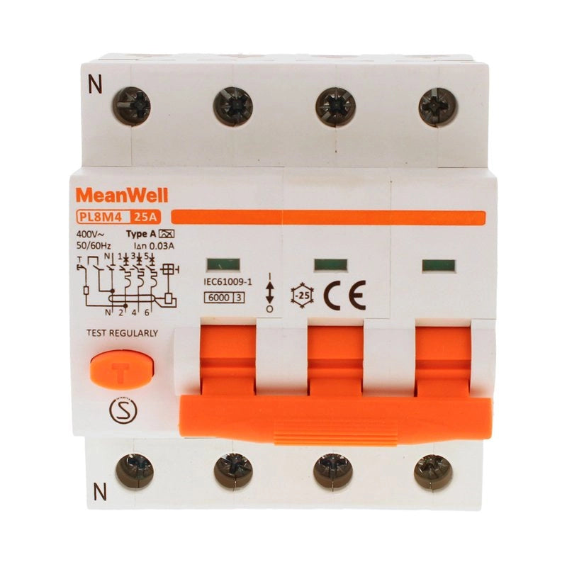 Magnetotermico Differenziale MeanWell Tipo A Curva C 3P+Neutro 4M 6kA 30mA C25A 400V IP20 IEC61009