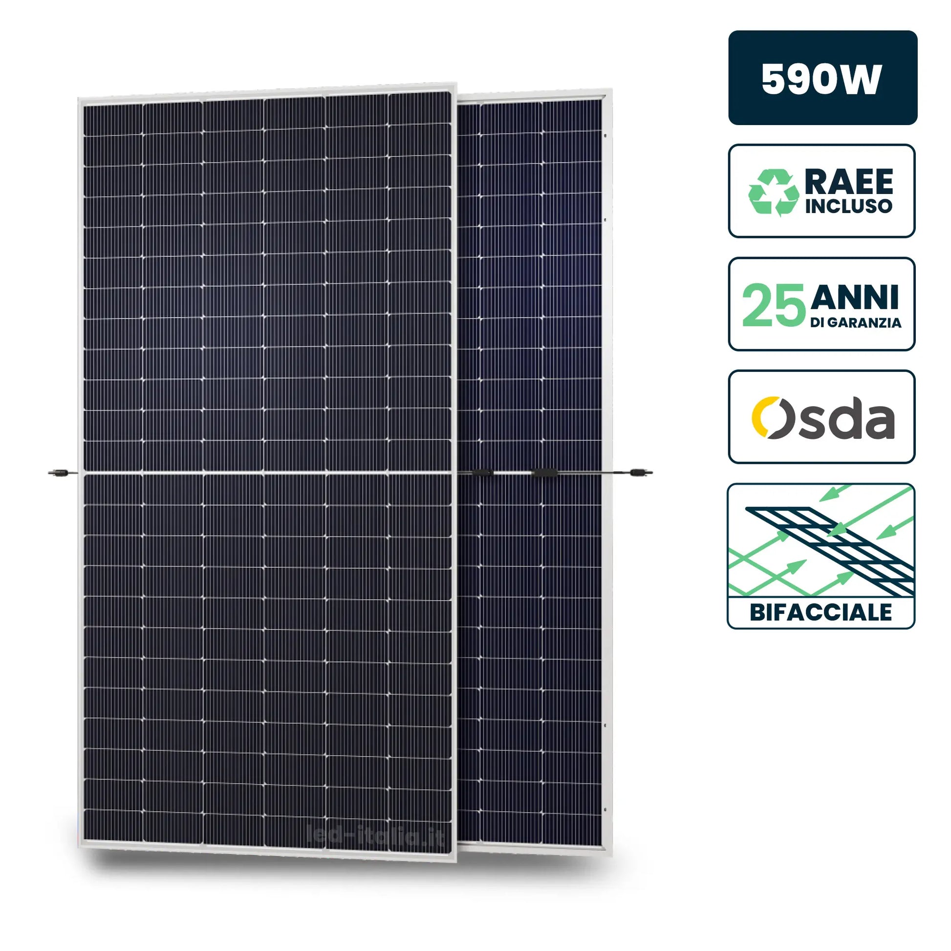 Pannello Solare Fotovoltaico Modulo 590W Bifacciale Austa OSDA Solar TIER-1 Monocristallino N-Type TOPCon Silver Frame IP67/IP68 2278x1134x30mm